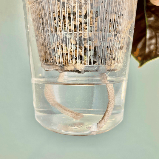 En selvvanningspotte består av en innerpotte og en ytterpotte. Ytterpotten er tett og har et vannlager i bunnen, som trådene trekker vann fra og opp til planten. Du sparer mye tid ved å kunne vanne sjeldnere og å vanne direkte oppi potten. Når vannlageret i ytterpotten er tomt, er det på tide å vanne igjen. Pottene er gjennomsiktige for at du enkelt skal kunne se når planten trenger mer vann. Les hva jeg anbefaler å potte med her.