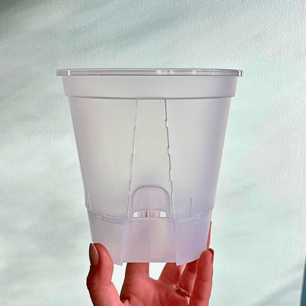Gjennomsiktig potte med avtagbart vannreservoar. Du kan enten vanne direkte oppi ponen/jorden eller vanne inn i vannreservoaret.